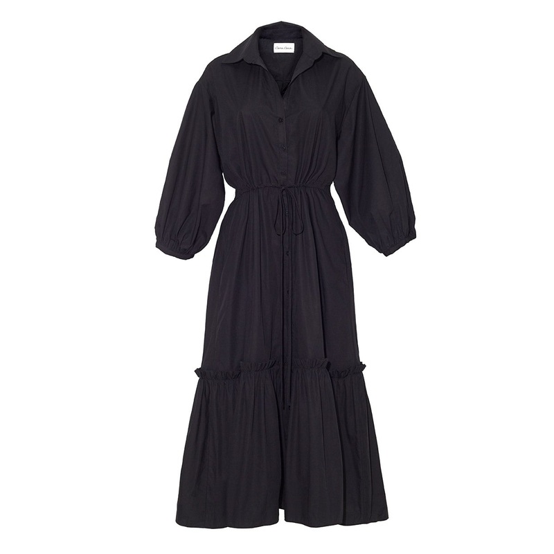 Founded by three NYC moms, who met through their kids, Cara Caras hallmarks include crisp poplin, house-designed prints, and casual glamour. Ethically constructed and cheerful in tone, the inspiration for their womenswear comes from interior design, as well as the worlds most exotic locales.Nothing is more romantic than the Hutton dress, especially in Black. The dark tones gives way to romantic notions when it’s combined with puffed sleeves and drawstring waist. Always elegant, this will become an instant wardrobe favorite.